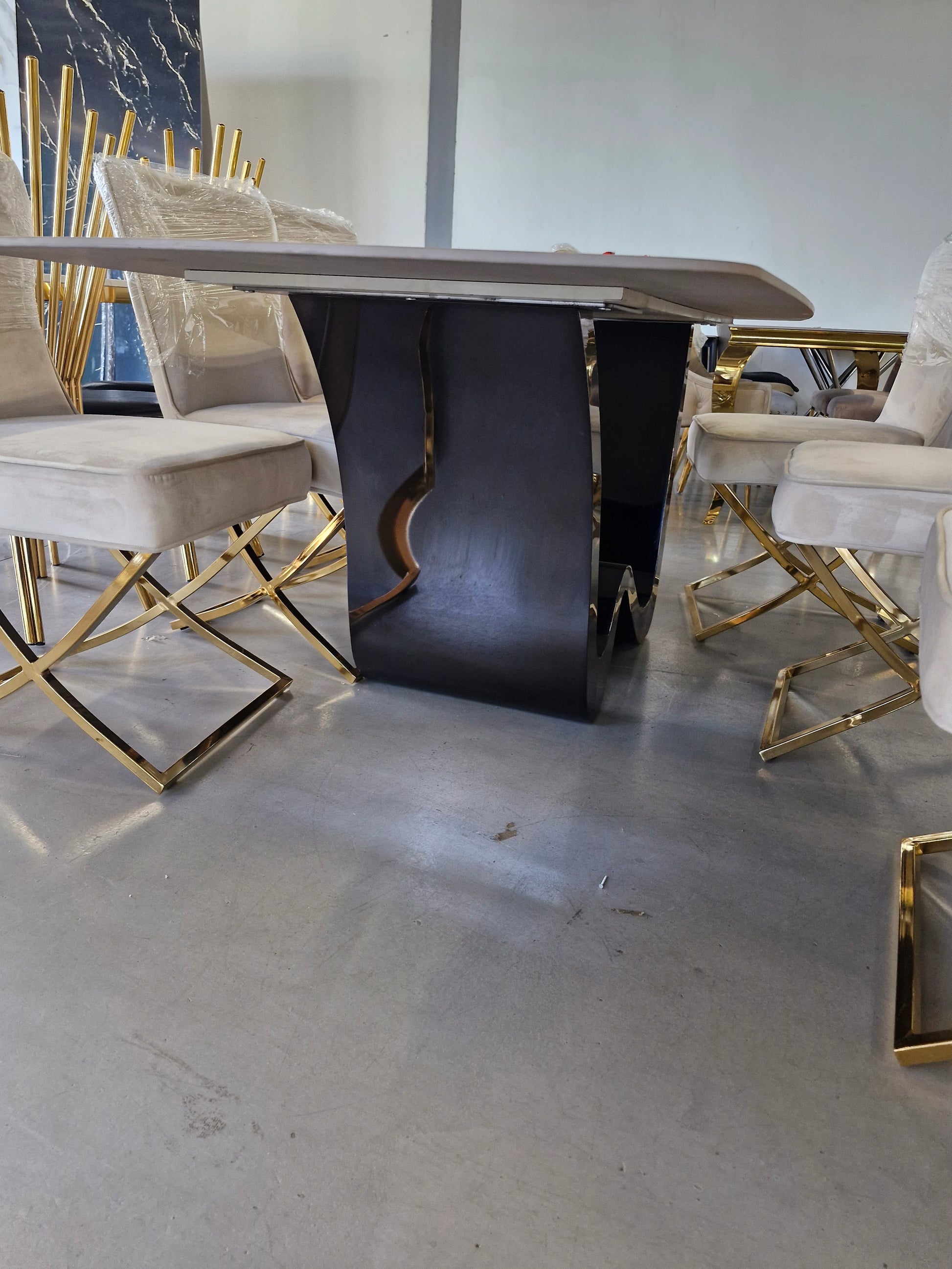 Expertly crafted for a modern touch, indulge in the luxurious Alanya dining table. Featuring a sleek gloss black design and a stunning marble slate top, elevate any dining experience with this contemporary piece. Guaranteed to impress, the Alanya is a statement piece that will enhance any dining space.