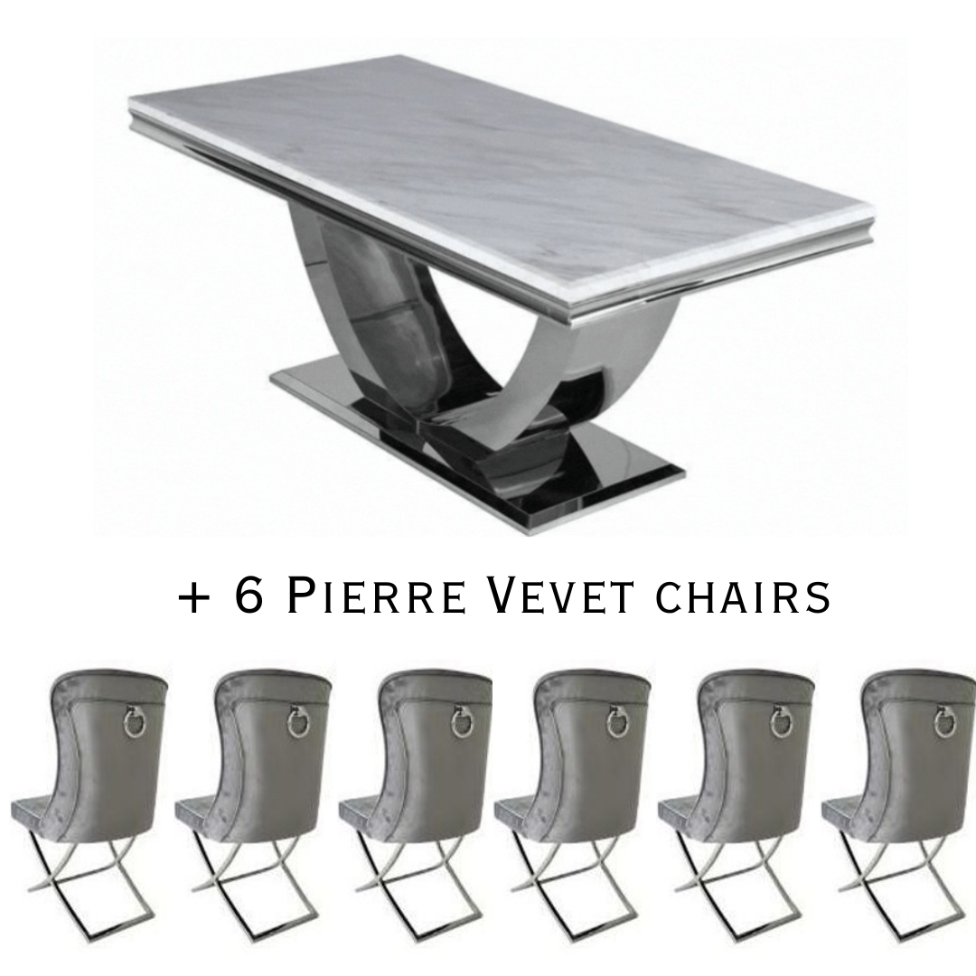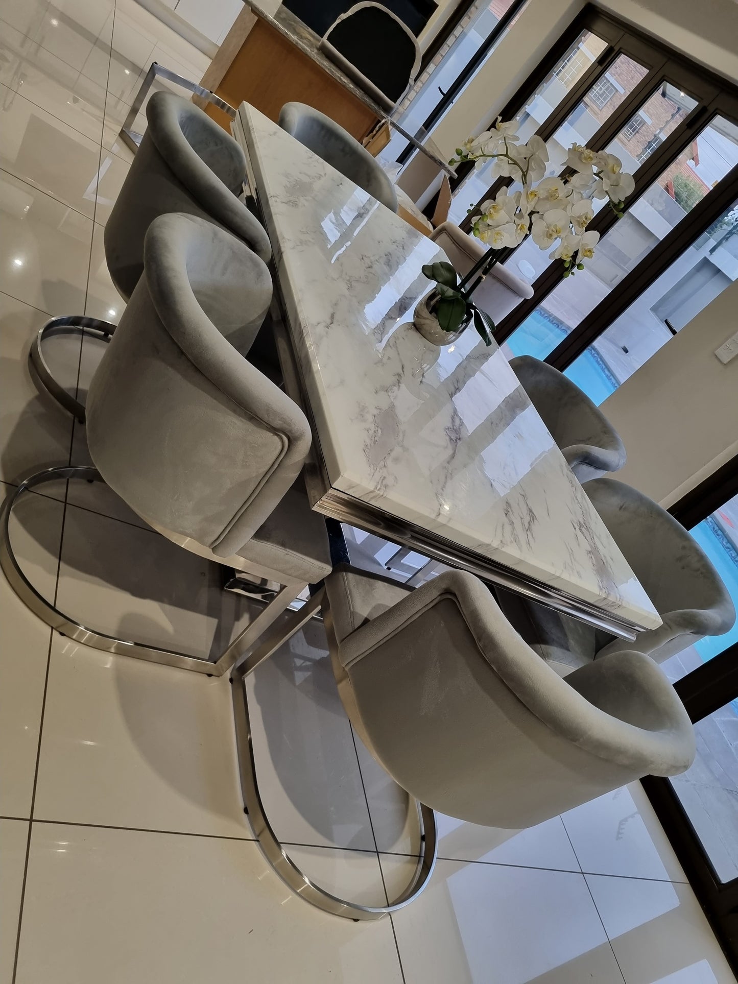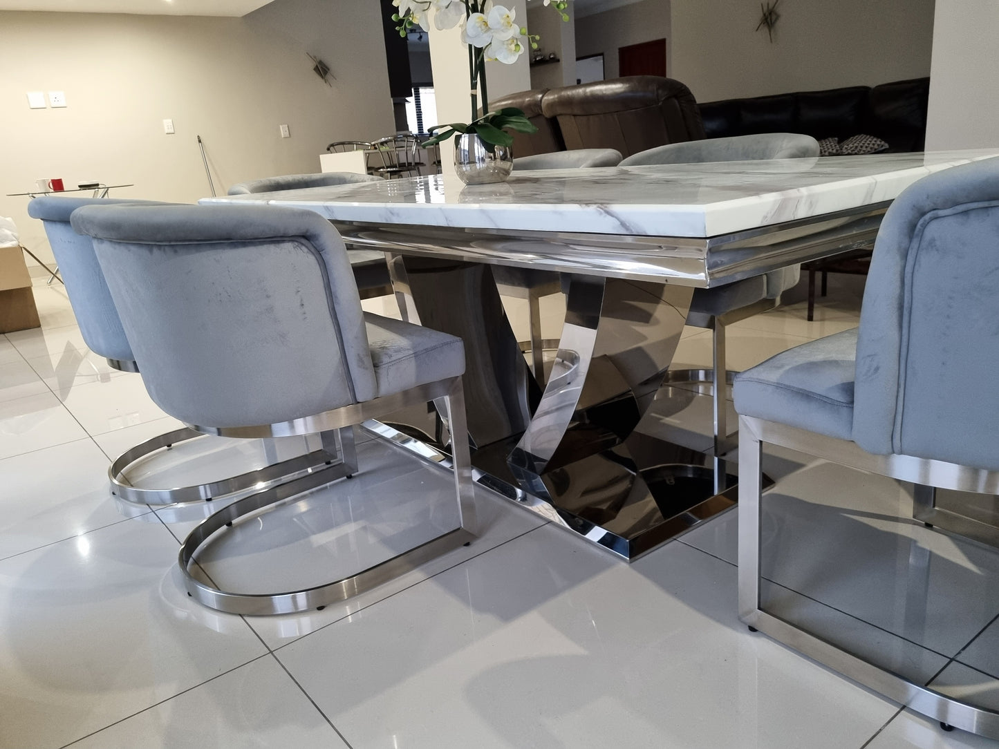 The Alvaro dining table oozes style and sophistication. Featuring a beautiful grey marble top and striking billowed stainless steel legs, this contemporary dining table offers style, durability and functionality. Generously sized this dining table will work well with a wide range of modern dining chair styles.