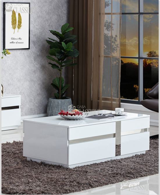 The Arabella coffee table boasts smooth, clean lines. It’s designed with 2 drawers, and the table top covered with tempered glass, then lightening by the stainless steel in gold