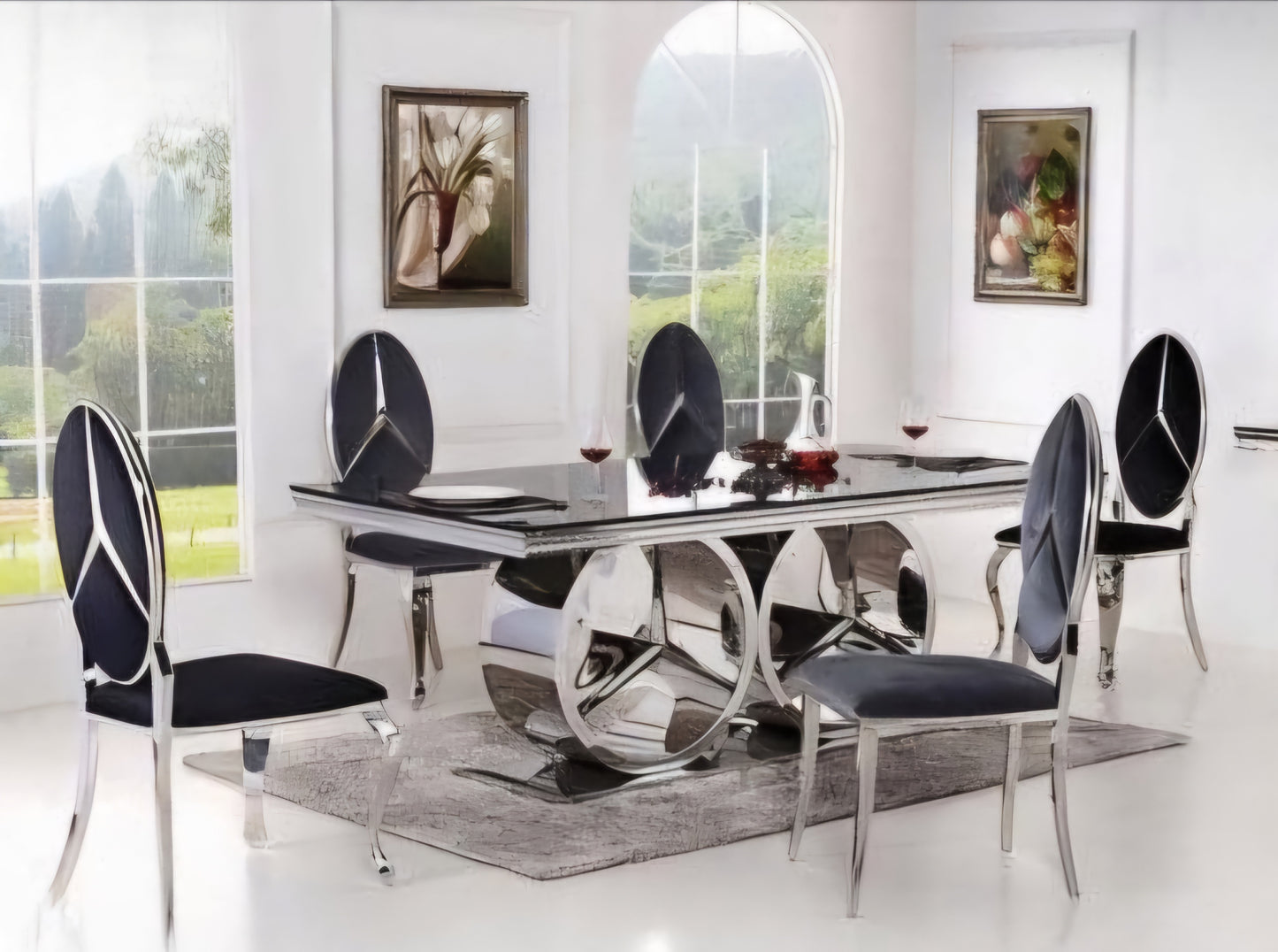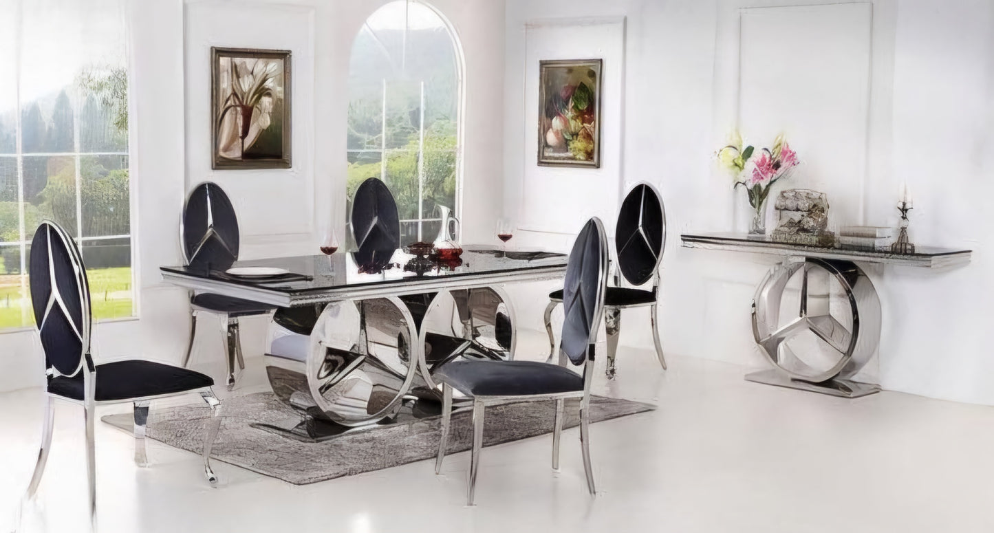 Indulge in luxurious dining with the Benz Luxe Dining Set. The statement dining table features a sleek glass top and is paired with 6 or 8 matching chairs, all designed with elegance in mind. Elevate your dining experience with this high-end set.