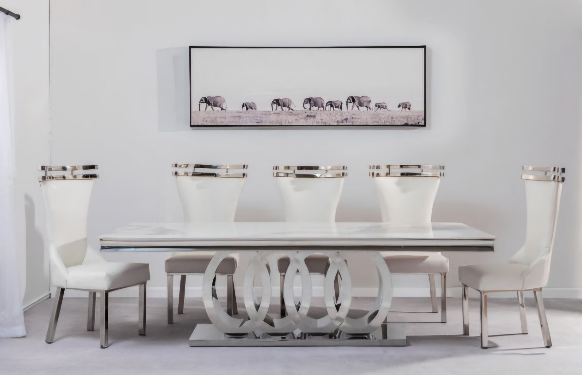 Upgrade your dining experience with the Chateau/Dolce Vita Luxe Set. This beautiful set includes a luxurious Dolce Vita silver table and matching Chateau dining chairs. Perfect for hosting large gatherings, this 8 or 10 seater set exudes elegance and sophistication. Elevate your dining space with this stunning combination of style and comfort.