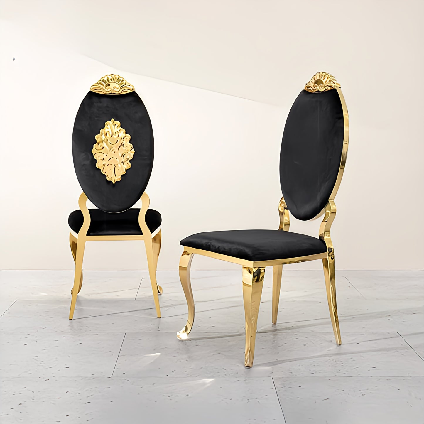 The Ambrosia Gold Dining Chairs are the epitome of regal luxury. Crafted from lustrous gold metal and luxurious velvet, these chairs are the perfect complement to any sophisticated, timeless décor. Their classic silhouette and elegant craftsmanship make them an ideal choice for creating a distinguished atmosphere around your table.