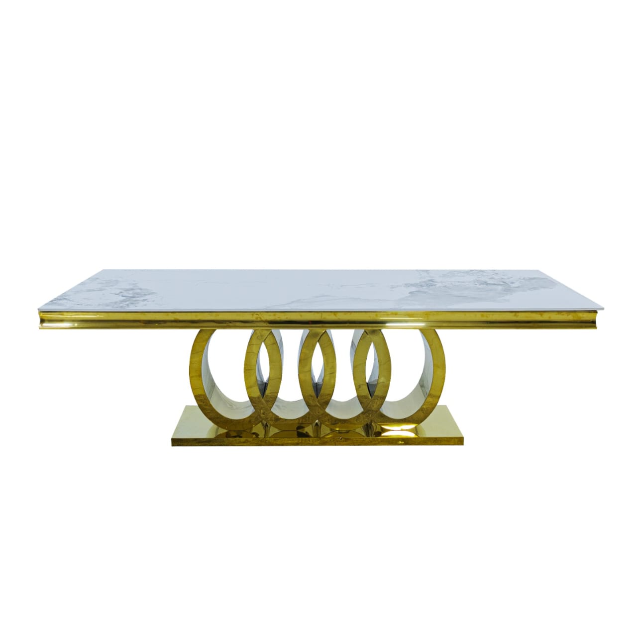 Grace your dining area with the luxurious Dolce Vita Dining Table. The exquisite gold finish exudes regal opulence, while the bold design is sure to make a statement in any space. Add a touch of modern glamour and sophisticated style to your home. Features mother of pearl detailing around the table.