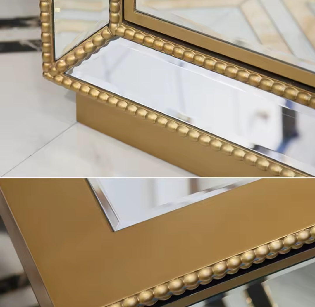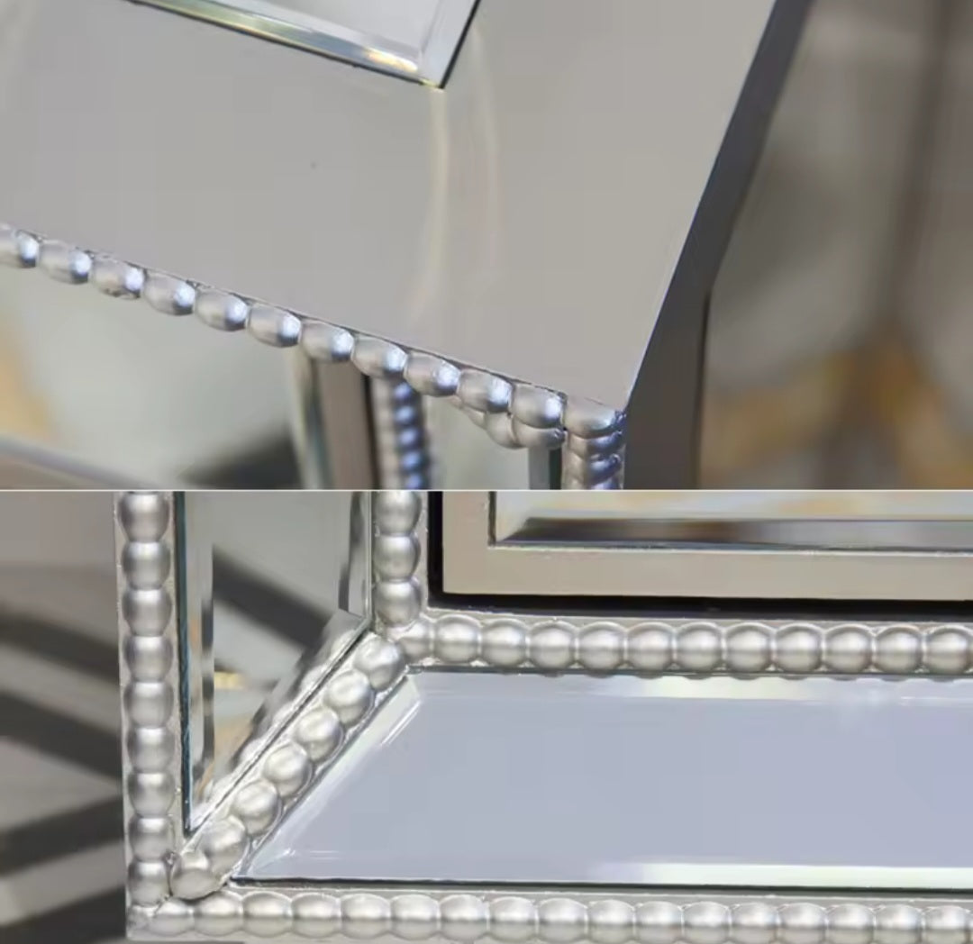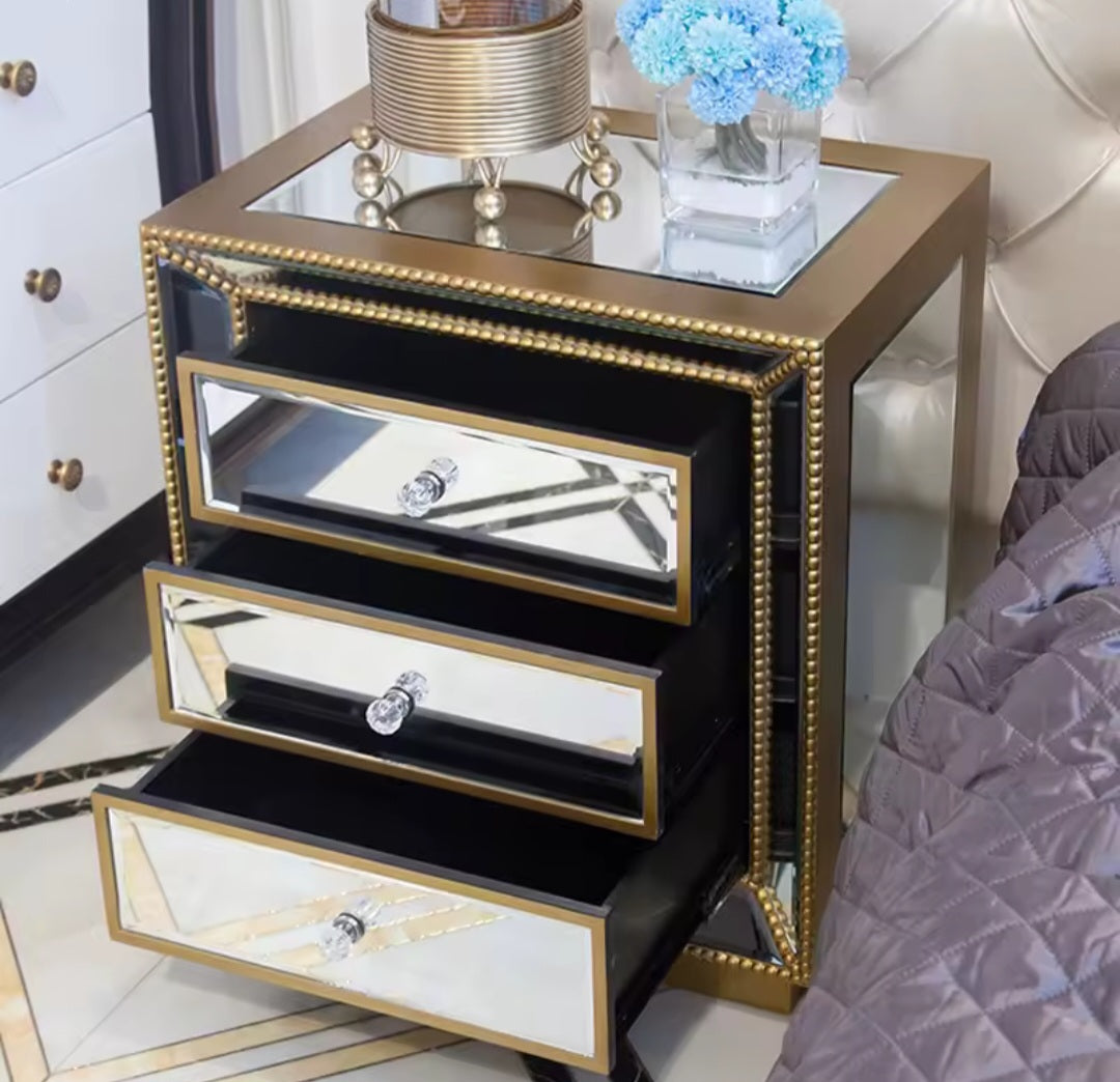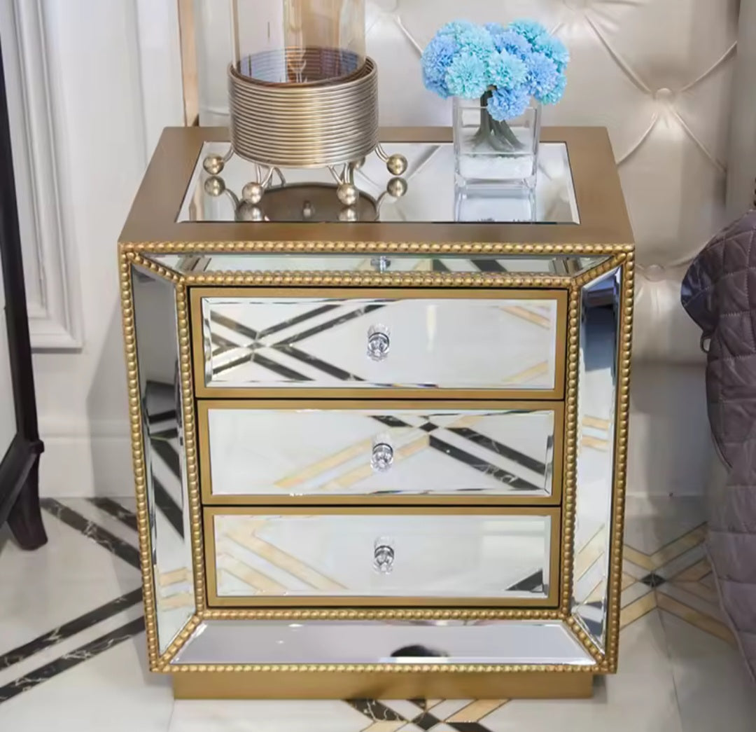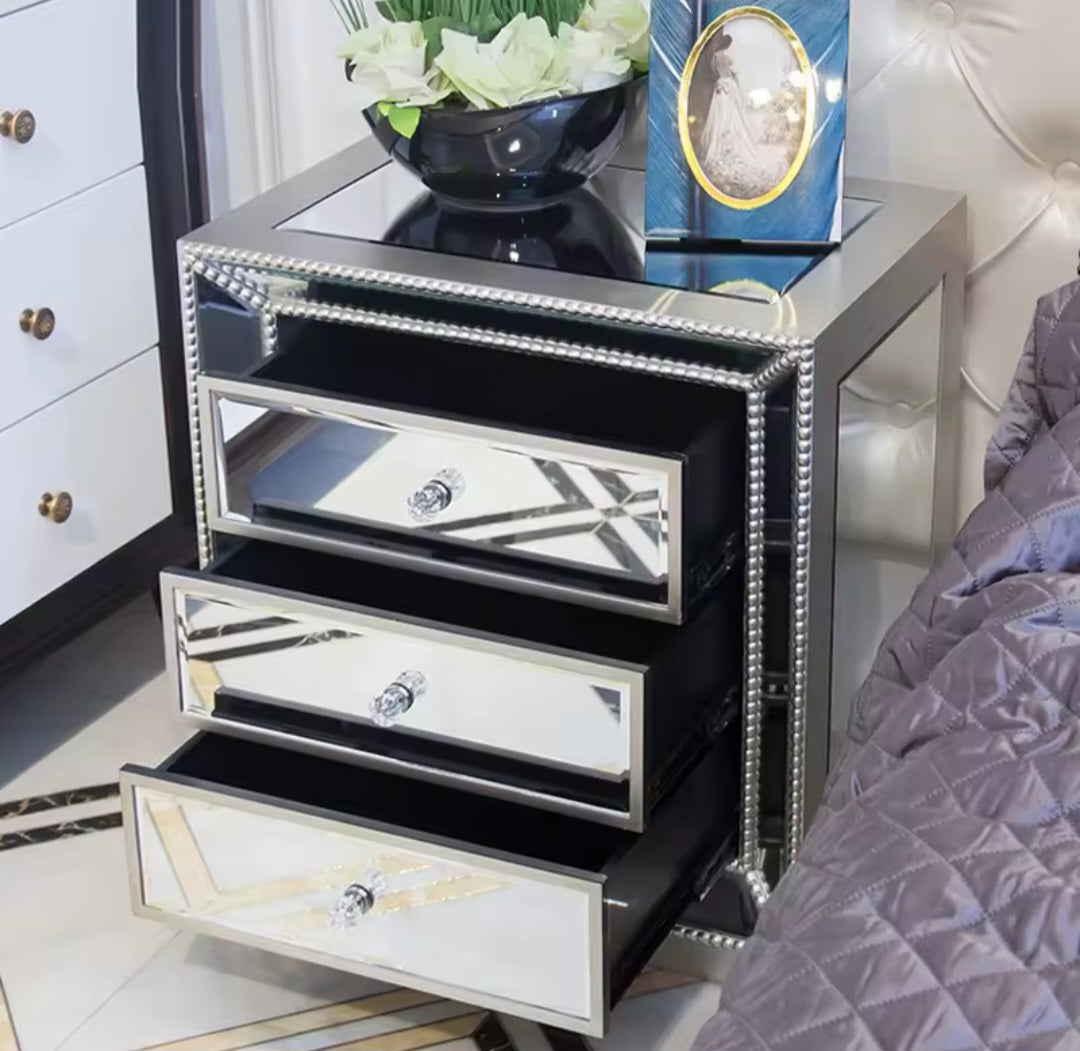 Add a touch of luxury to your bedroom with the Egnazia Mirrored Nightstand. This stunning side table features a mirrored finish and a convenient drawer for storage. Elevate your bedside with this stylish and functional piece.