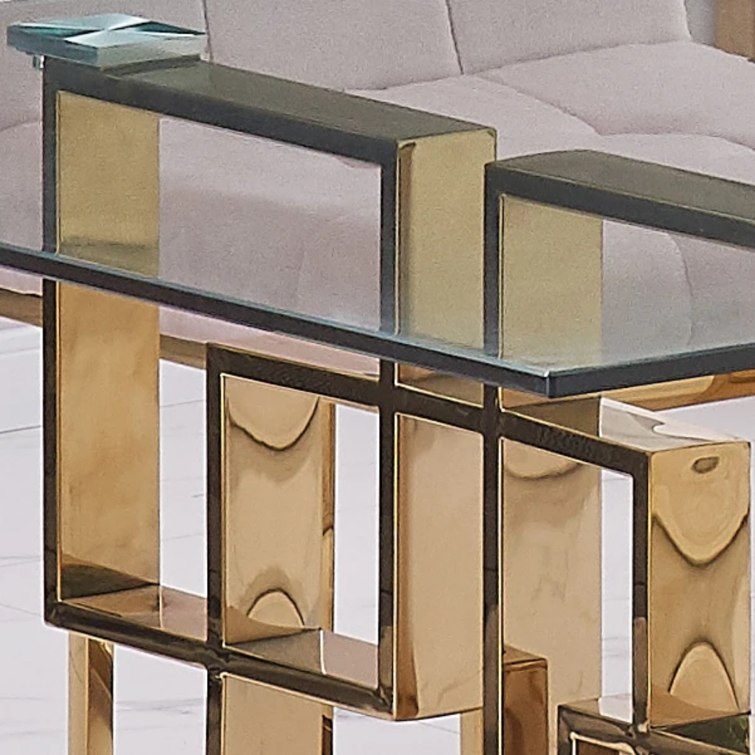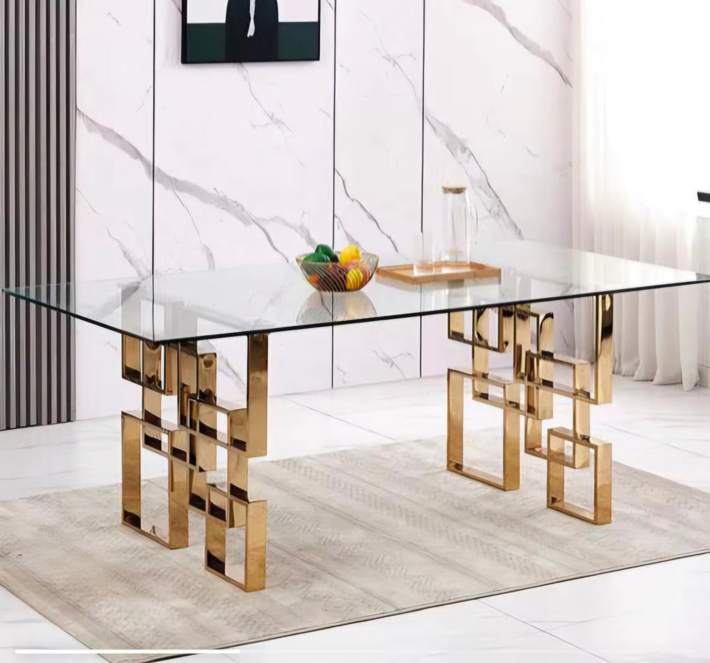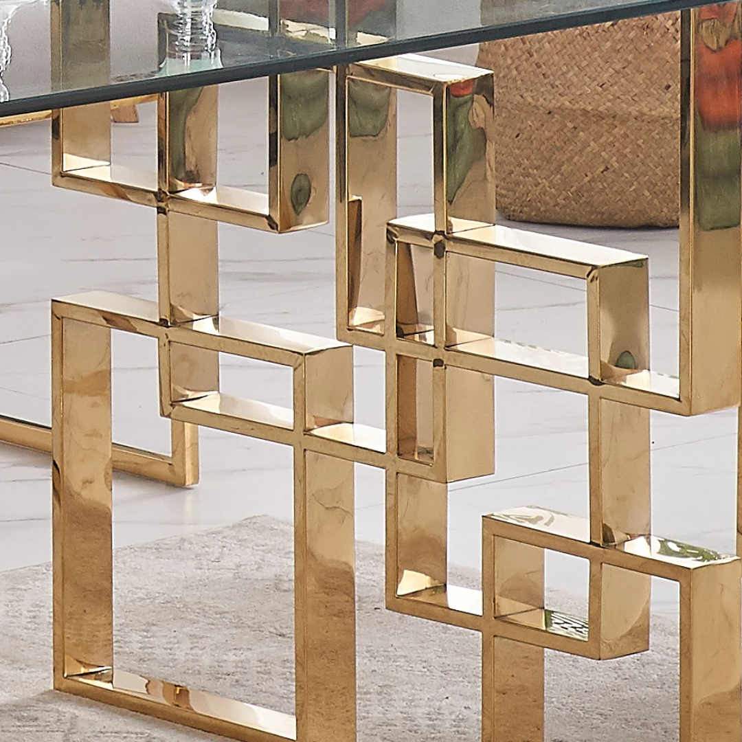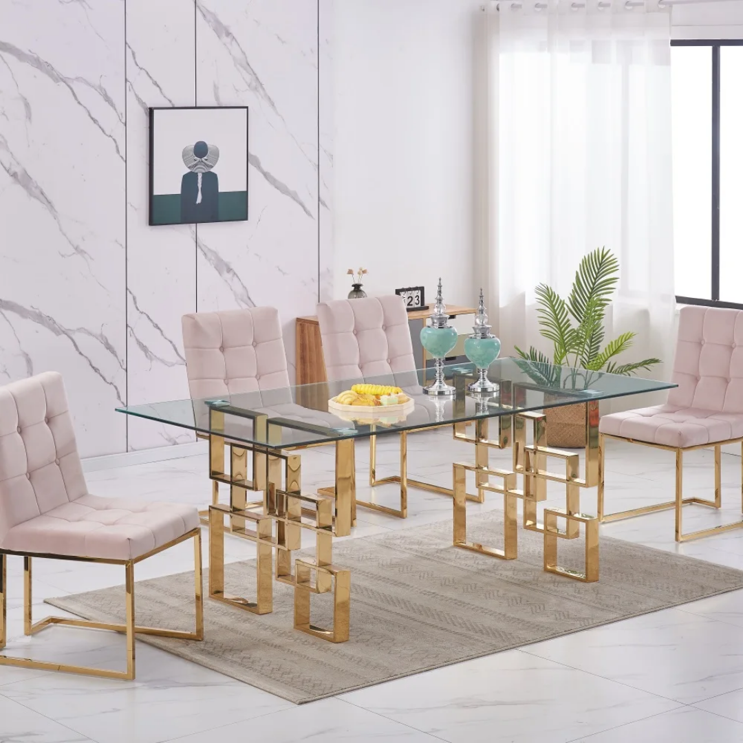 This Estavo Dining Table boasts a beautiful gold base and a sleek glass table top. The stylish design adds a touch of elegance to any dining room. The sturdy construction ensures durability while the glass top provides a modern and chic touch. Upgrade your dining experience with the Estavo Dining Table.