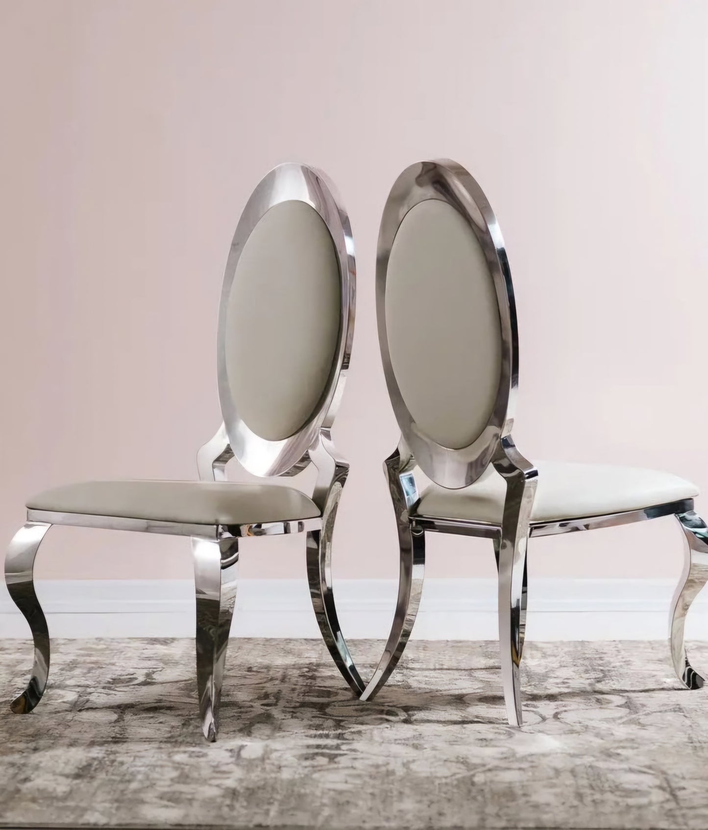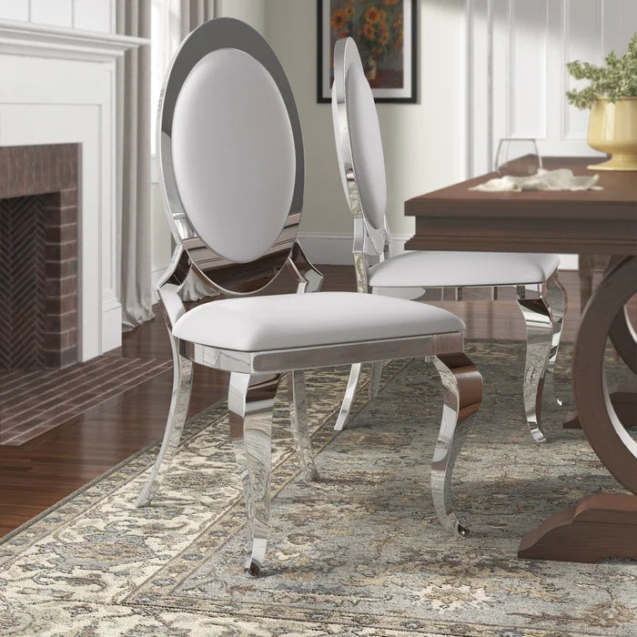 This transitional style dining chair has leatherette upholstered back and seats that confers comfort to this chair. It also sports cabriole style front leg and flared back legs that impart a unique character to the design of this chair.