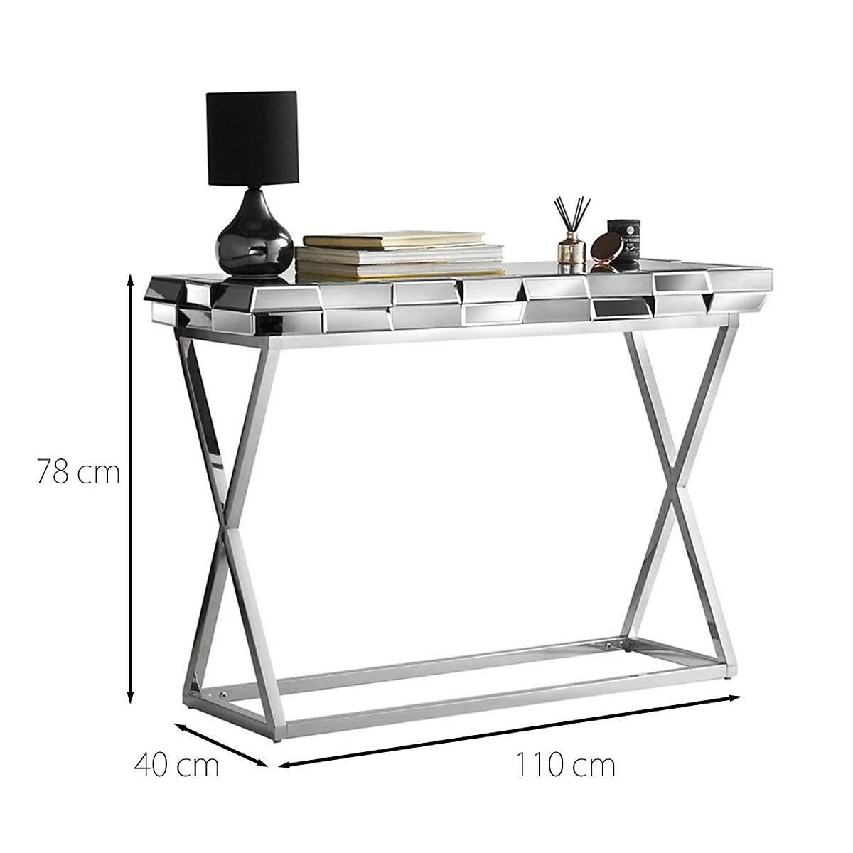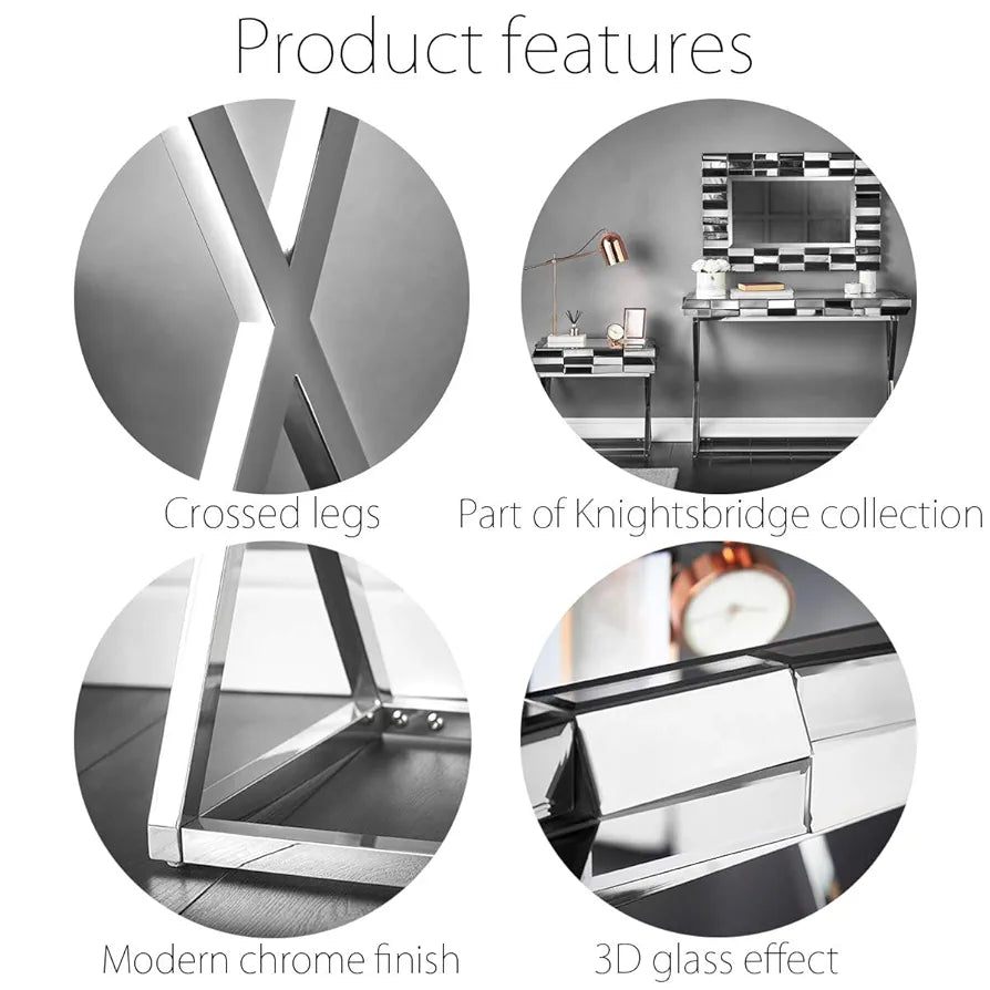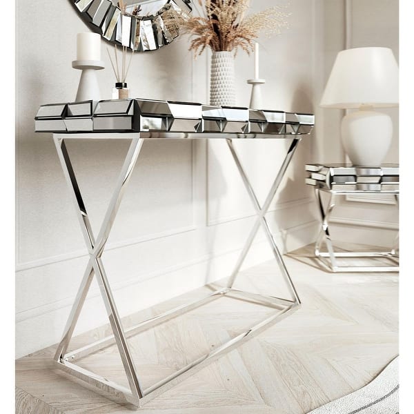 This luxury mirrored glass console table showcases a 3D effect. The modern chrome crossed leg design finishes off this stunning piece. This eye-catching accent table will give any hallway, living room or bedroom a contemporary feel.