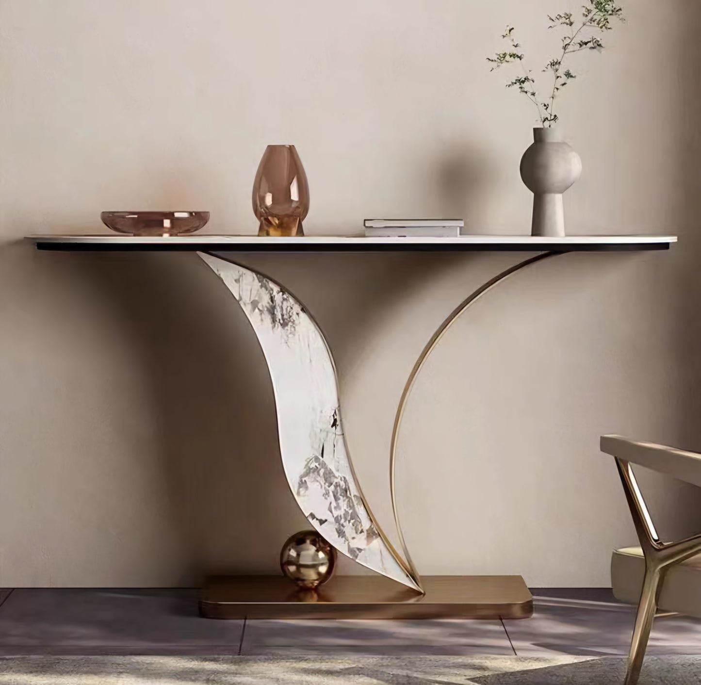 The Margutta console is a stunning addition to any living space. Its elegant design showcases a gold base and ball slate top, adding a touch of sophistication to any room. Made with high-quality materials, this console is not only beautiful but also durable. Elevate your home decor with the Margutta console.