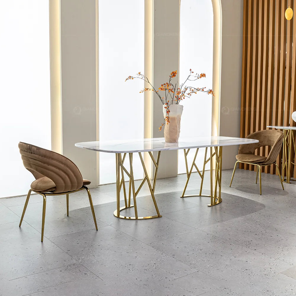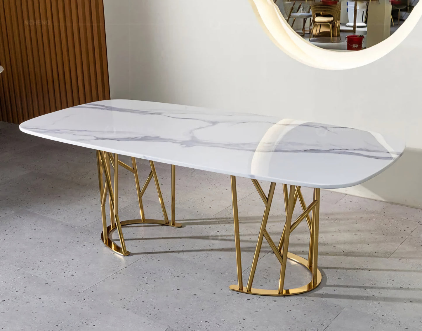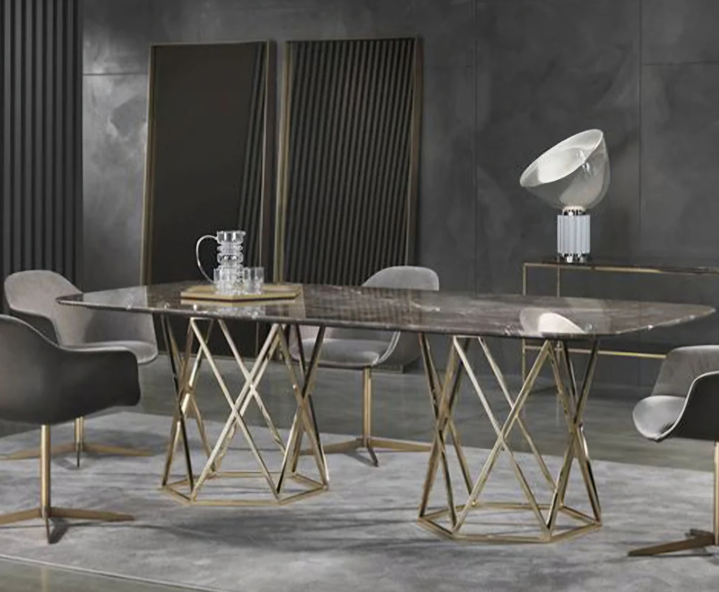 Expertly crafted with a gold base and marble top, the Nepal dining table boasts a unique design that adds elegance to any dining room. Its sturdy construction ensures long-lasting use, making it the perfect addition to your home.