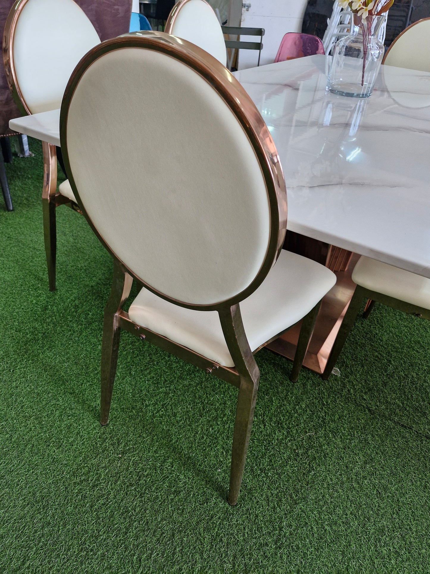 Introduce a touch of elegance and sophistication to your dining space with our Rose Gold Dining Chair. With a luxurious rose gold frame and sleek white seats, this chair will elevate the aesthetic of any dining room. Experience the perfect blend of style and comfort with our Rose Gold Dining Chair.