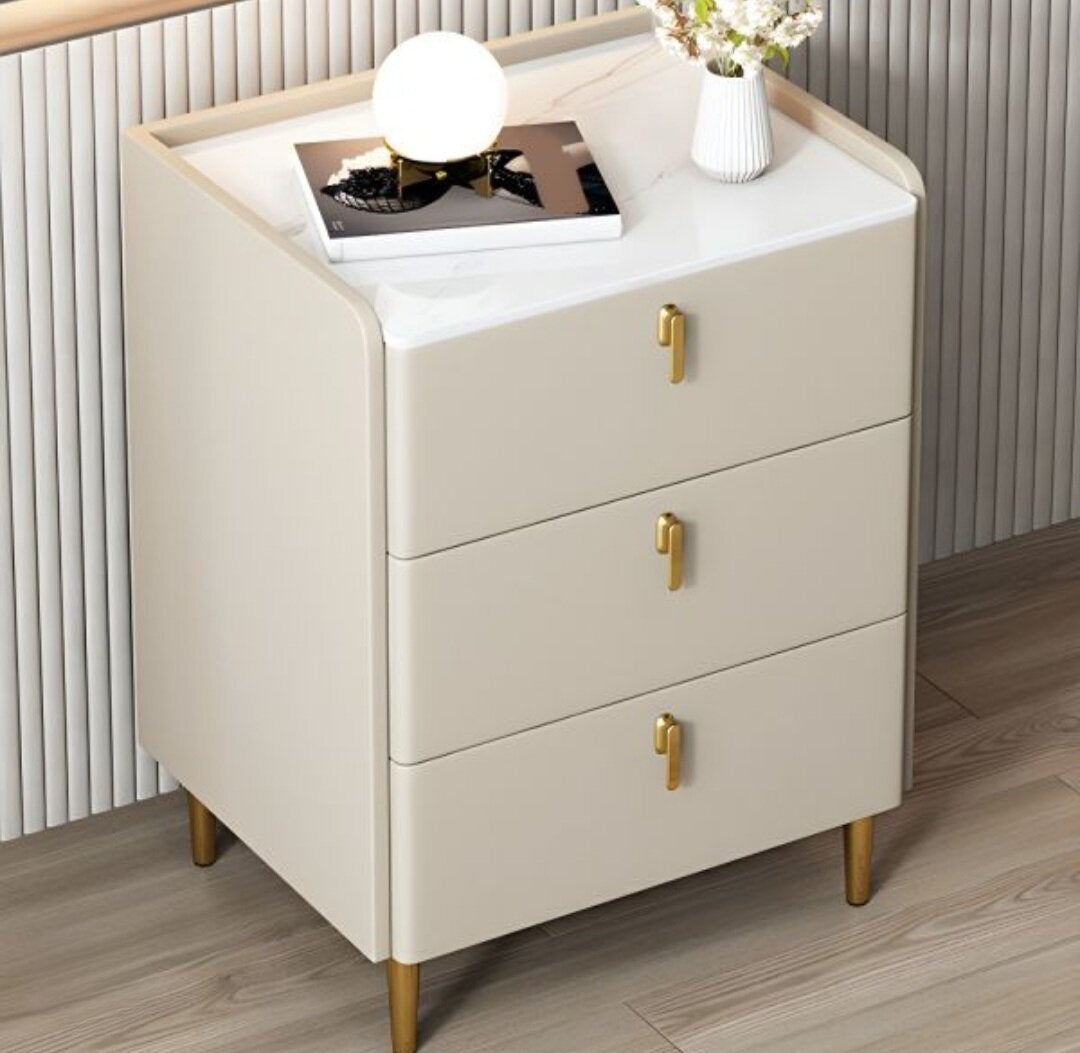 This elegant nightstand features 3 drawers for convenient storage and eye-catching gold legs and handles. Add a touch of luxury and organization to your bedroom with the Melia nightstand.
